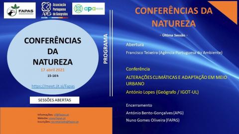 “Alterações climáticas e adaptação em meio urbano” - António Lopes (IGOT-UL) | Ação de Curta Duração com Certificação (organização: FAPAS, APG, APA) e com especial interesse para os docentes dos grupos de recrutamento 230, 420 e 520. Encerramento com a participação do presidente da Associação Portuguesa de Geógrafos.