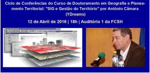 No âmbito do Ciclo de Conferências do Curso de Doutoramento em Geografia e Planeamento Territorial, anuncia-se que a próxima sessão realiza-se no dia 12 de Abril de 2016, pelas 18h, no Auditório 1 da FCSH, que será da responsabilidade do Professor Doutor António Câmara com o tema "SIG e Gestão do Território".