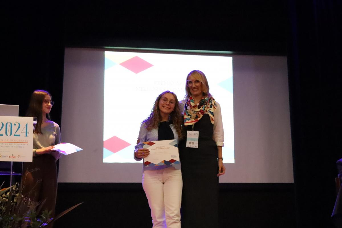 De seguinta, o momento foi também para a entrega dos diplomas aos vencedores do "Prémio Melhor Estudante 2024". Deste modo, Rita Cardoso Paiva, com 189,5 de média de entrada na Faculdade de letras da Universiade de Coimbra, e Joana Margarida Pacheco Martins com média de entrada 188,8 valores na Faculdade de Letras da Universidade do Porto, receberam os respetivos diplomas das mãos de Elisabete Fiel, como representante da direção da Associação Portuguesa de Geógrafos.