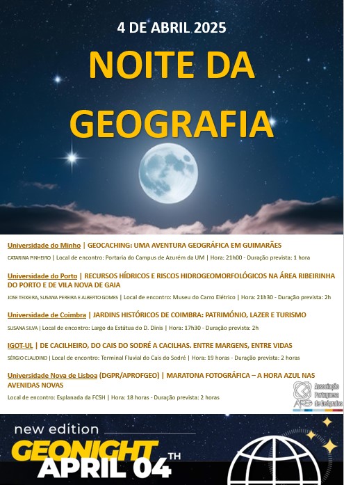 A GeoNight é uma iniciativa proposta pela primeira vez pelo CNFG (Comitê Geográfico Nacional Francês) em escala nacional em 2017. A partir de 2018, a iniciativa expandiu-se internacionalmente, primeiro na Europa, graças à EUGEO, e depois ainda mais além, graças à UGI. A APG aderiu à iniciativa e apresenta 4 visitas de norte a sul do país com a colaboração das Universidades com formação superior em Geografia. A iniciativa é aberta a todos os interessados.