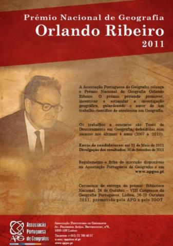 A APG tem a honra de anunciar que o Prémio Nacional de Geografia Orlando Ribeiro 2011 foi atribuído ao trabalho "La métropolisation au Portugal: processus et politiques spatiales" de Patrícia Catarina dos Reis Macedo Abrantes. Foram ainda distinguidos com uma Menção Honrosa os trabalhos Images and representations of Ireland in Portugal (1830-1925): Geographical knowledge and Geographical imagination, de José António Gonçalves Horta e "Geografia e Cinema. Representações Culturais de Espaço, Lugar e Paisagem na Cinematografia Portuguesa" de Ana Francisca de Araújo R. Azevedo e Silva.