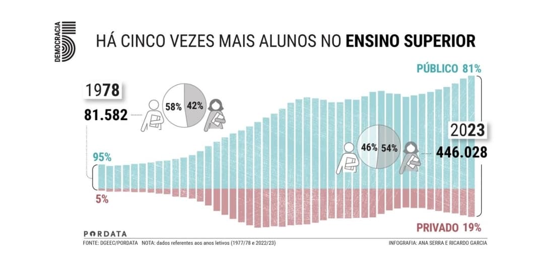 A leitura do infográfico sobre a frequência do Ensino Superior evidencia que em 2023 há cinco vezes mais estudantes que em 1978. Em 2023, 54% destes estudantes são mulheres.
