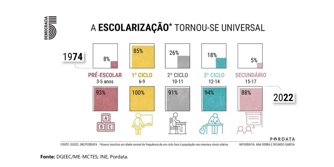 Em Portugal, em 1974 os números sobre a frequência da escola eram reduzidos, nomeadamente entre o 2º ciclo e o secundário. O investimento na educação desde 1974 permitiu o acesso da população ao conhecimento, mesmo ao reconhecimento de competências adquiridas ao longo da vida. Entre 1974 e 2022 o aumento da frequência do ensino secundário verificou-se de forma exponencial, atingimos 88% e ainda temos 12% que não conclui esta etapa.